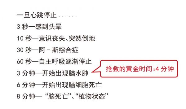 遇到心脏骤停、晕厥、濒临猝死的人,应该运用“黄金救援4分钟”法则,即当发现有人无意识、无呼吸、无心跳时,判断为临床死亡状态,应立刻施救。