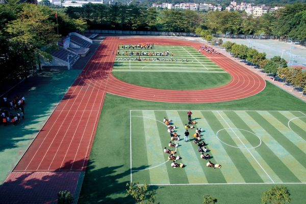 依傍在美丽的南香山脚下的镇泰学校,风景秀美,校园宽敞,鸟语花香。一到学校,映入眼帘的是气派的校门,很是宽敞,整个校园掩映在树丛中,一条白带似的水泥大道由校门向校园里延伸。校门后的右边,是几个宽阔的操场、篮球场,偎依在篮球场旁的是绿草如茵的足球场。橙色的两幢教学楼雄伟而挺拔,形成一个“L”型字。