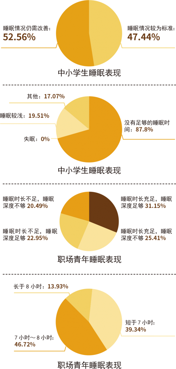 调查发现,有近9成中小学生存在睡眠时长不足问题,7成青年不能深度睡眠。时间观念缺乏与电子产品正影响着当代青年的睡眠。对于睡眠的改善,超6成的职场青年采取顺其自然的态度;而中小学生睡眠状况的改善则被认为需要家庭、学校等方面的共同努力。