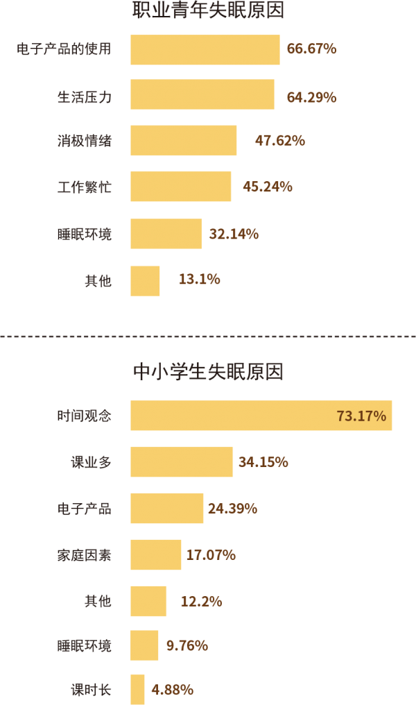 相较于职场青年,中小学生的睡眠问题往往被归根于其自身时间观念的缺失。缺乏时间观念这一答案高达73.17%,远超其他因素。但也可以看到,课业依然是与中小学生睡眠紧密相关的外界因素。