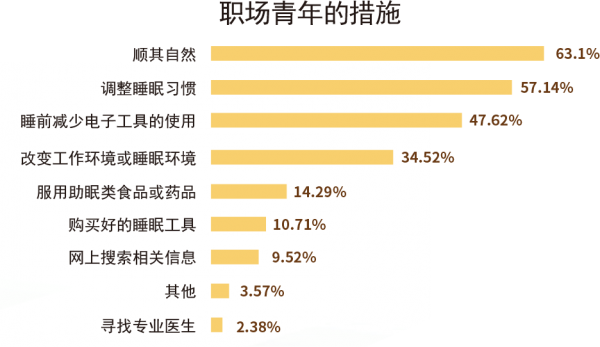 在对待睡眠健康问题上,两类调查对象显示出不同的态度。有超过63%的青年选择顺其自然,除此之外,他们还倾向于通过调整睡眠习惯或减少使用电子工具来改善睡眠状况,但与此同时,职场青年较少有意愿通过网络寻找相关信息处理睡眠问题。