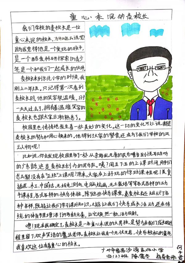 嗯!现在我确定了,麦校长就是一名童心未泯的“大男孩”,是努力在我们成长过程里留下欢声笑语的魔法师。麦校长让我有一个无忧无虑、快乐轻松的童年,我喜欢这位有着童心的校长。