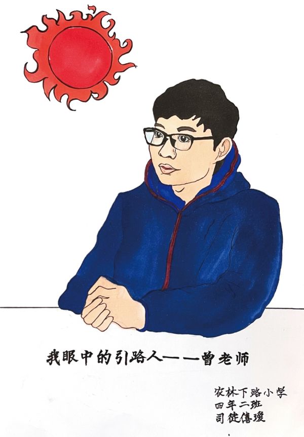曾老师上美术课时,会给一个主题让我们自由绘画,而不是让我们临摹或模仿别人的作品,使我们可以天马行空地进行创作。他批改我们的美术作业也与众不同,他知道,每位同学都是认认真真画的,所以他常会在上面给大家打A,从来不打B和C。对于画得比较有特点、有想法的,还会打上A++。曾老师的美术课给了我们充分的鼓励,让我们充满了自信和愉悦。