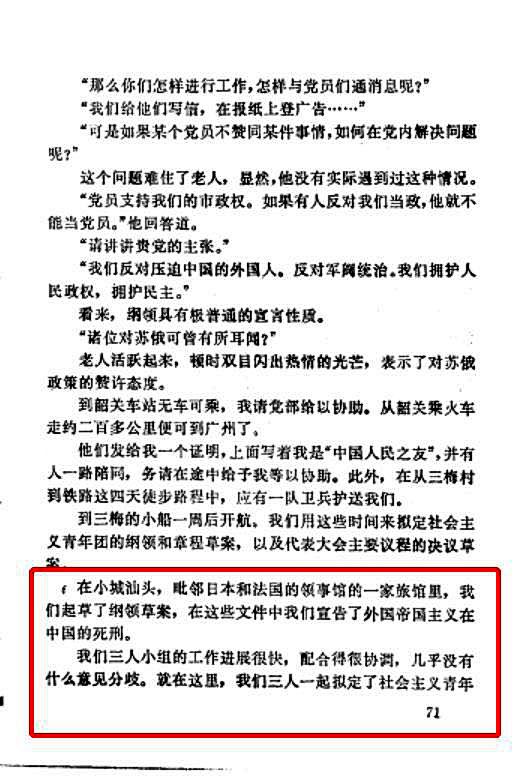 在小旅馆里,张太雷一行起草了中国社会主义青年团的团纲、团章等各种决议草案。这是中国共产党领导的团组织的第一份团纲和团章。达林回忆时兴奋地说:“在这些文件中我们宣告了外国帝国主义在中国的死刑。”