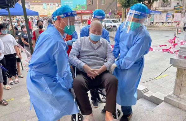 “我就是你的眼。”在前进街盈彩社区盈彩美居中庭核酸检测点,青年志愿者林蕊看到有一位盲人小哥拄着手杖向检测点走来,她赶紧跑过去全程陪同和指引他进行核酸采样。检测结束后,林蕊又将其安全送回才放心离开。