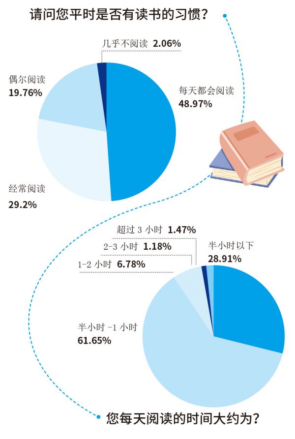 调查显示,大部分小学生拥有良好的阅读习惯。其中有48.97%的青少年每天都会阅读,29.2%经常阅读,只有2.06%的青少年几乎不涉猎阅读。但在阅读时间长短中显示,青少年每天阅读的时间在“半小时到一小时”为最多,时间上不算是特别长。实际阅读率存在上升空间。