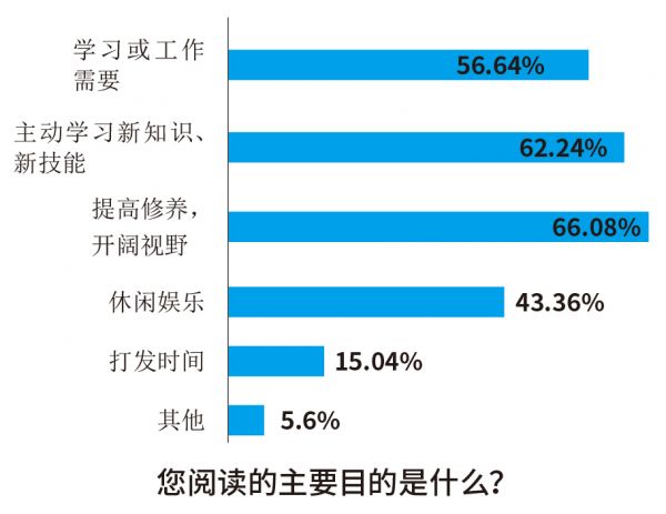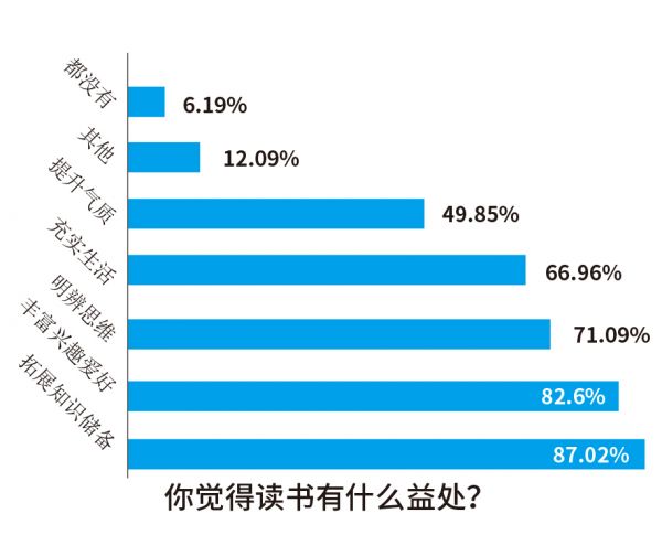 调查显示,在读书收获一项中,“拓展知识储备”高居首位,高达87.02%;第二的则是“丰富兴趣爱好”,有82.6%;“明辨思维”排名第三71.09%;“充实生活”排在第四66.96%。四项选择均超过半数,成为共趋性的倾向。