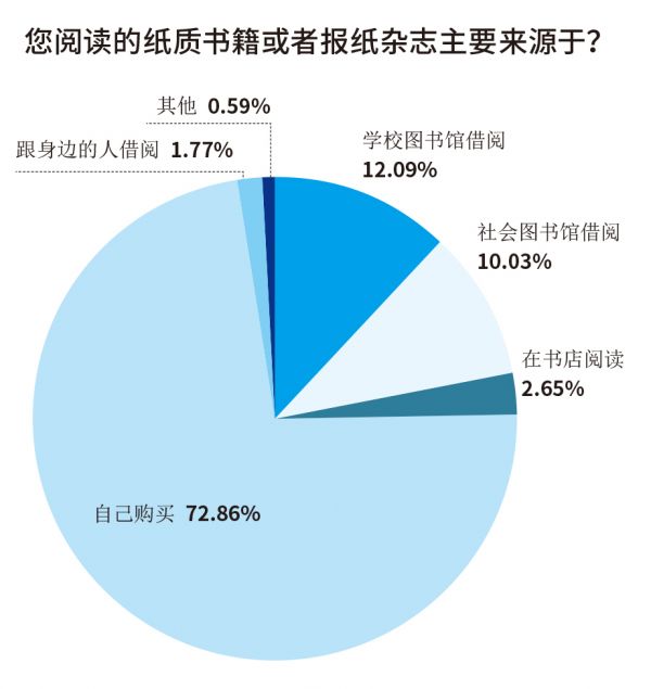 调查显示,青少年阅读的图书、杂志有72.86%来源于自行购买,反映出青少年获知书籍信息的渠道存在单一性。低年龄段的阅读显示出家长的主导性,普遍是家长为孩子准备儿童读物,先购买回家,再进行阅读。阅读来源学校图书馆比例仅有12.09%,反映出中小学图书室、图书馆建设还有待加强。许多学生存在不了解学校阅览建设的情况,学校可以在增强读书宣传力度、开展读书活动、评比读书奖励等方面实行积极的推动措施,促进学生进行阅读。同时,阅读来源社会图书馆也仅有10.03%,显示了孩子们较少前往公共文化场所,文化设施的利用率不高。青少年的文化活动组织拓展还有较大提升空间。