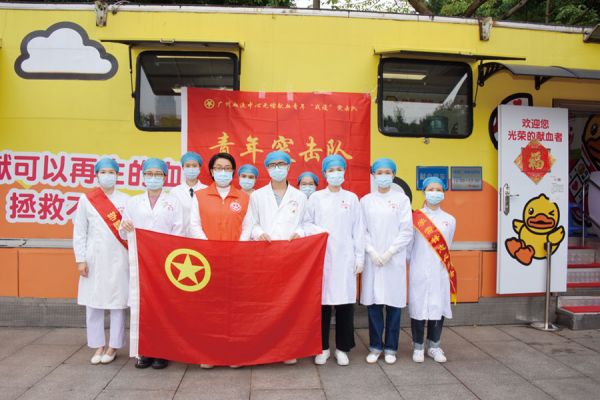 2020年新冠疫情暴发,血液需求量急剧上升。广州血液中心团总支迅速成立由110名青年组成的无偿献血战“疫”青年突击队,由团总支书记担任队长,对应三个团支部设立三个专职青年分队,充分发挥坚强的战斗堡垒作用。团员青年主动放弃休假外出计划,采取AB岗轮换上班制,坚守在采血一线,加班加点进行血液制备,先后向武汉、成都等地迅速支援红细胞悬液和新冠康复者血浆。2020年1月调配红细胞悬液500U, 8月调集全省康复者血浆1000ml至武汉救治急重症。12月调800U红细胞悬液支援成都。不仅如此,40名团员挺身而出,亲自下场,带动全单位合共80多名工作人员加入无偿献血队伍中。湖北省卫健委授予他们“抗击新冠疫情血液应急保障援助湖北突出贡献省市”光荣称号。