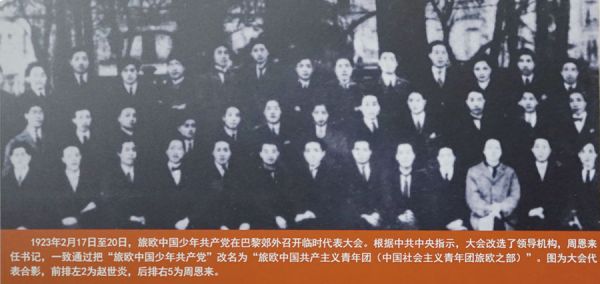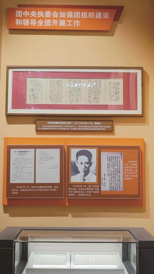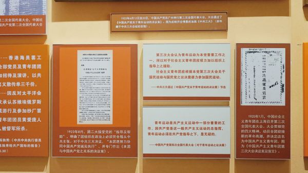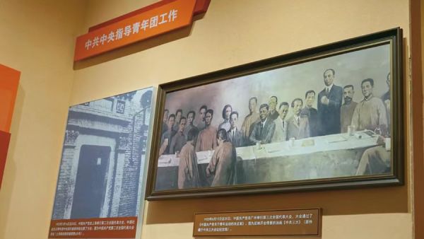 1922年7月,中共二大在上海召开,团中央局代表施存统出席了会议。1923年6月,中共三大在广州召开,这是反映开会情景的油画,大会通过了《中国共产党关于青年运动的决议案》,认为“青年运动为本党重要工作之一,所以对社会主义青年团应极力加以组织上指导上之援助”。