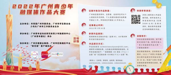 因近期疫情影响,应参赛各方要求,2022广州青少年融媒体大赛作品提交时间延长至5月30日。欢迎广大青少年朋友登陆快捷参赛报名通道,踊跃报名参加。