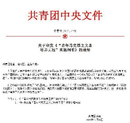 2007年5月,团中央启动了“青年马克思主义者培养工程”(简称“青马工程”),着力创新马克思主义理论宣传、学习的形式和载体,力争通过社会工作实践,培养一批政治坚定的青年骨干,锤炼出一批信念坚定的青年马克思主义者。