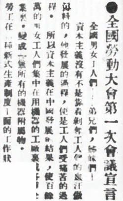 1922年5月1日,第一次全国劳动大会在广东机器工会礼堂隆重展开。当时,参加大会的代表共173人,代表了12个城市、110多个工会、34万多名有组织工人。中国共产党派出了包括李启汉、邓中夏、林伟民、苏兆征等备受拥戴的工人运动领导人参会。