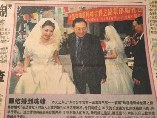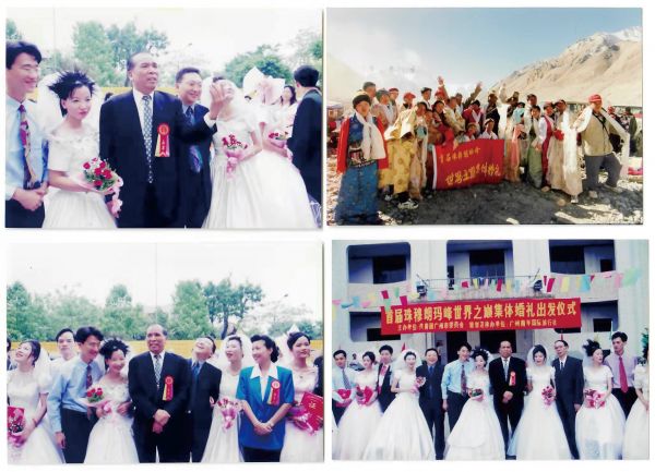 1998年,由团广州市委主办、广州青旅协办的“珠穆朗玛峰集体婚礼”在广州出发。该集体婚礼由原广州青旅副总经理、多项集体婚礼策划组织者杨成策划。婚礼当天吸引了众多群众围观并祝福新人,天空中有多架航模飞机盘旋并把金粉撒向新人。之后,新人们抵达青海省西宁市,沿着青藏公路向西藏和珠峰进发。尽管途中经历了高原反应,但新人们都克服了重重困难,一路坚持。当年的珠峰大本营条件有限,但集体婚礼还是很庄重。在神圣的珠穆朗玛峰见证下,婚礼以汉藏民族特色举办。此次集体婚礼共有9对新人参加,寓意着“长长久久”,同时也打开了国内集体婚礼在户外高原举办的先河。
