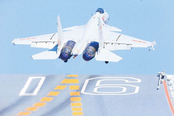 “飞鲨”在中国人民解放军海军辽宁舰起飞(图源:央广军事)