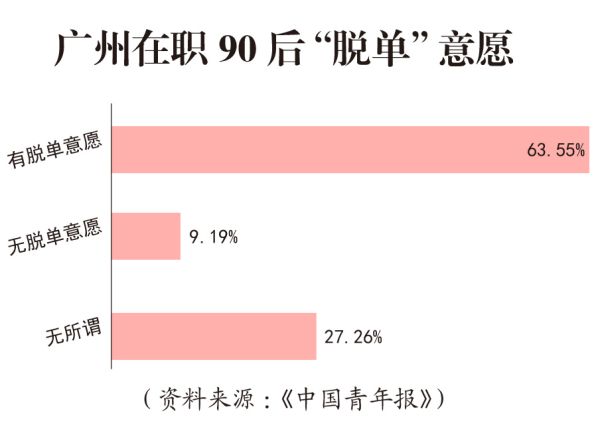 据《中国青年报》报道,广州在职90后“脱单”意愿调查显示, 63.55%的受访者有“脱单”意愿,但表示无所谓的占了27.26%。广州某高校软件工程毕业的方靖(化名)在英国取得硕士学位后回到广州工作,四年换了三家公司,职位一家比一家高,工资也一路提升。大学时有过一个关系有点密切的男生,毕业后她出国他回了内地,还没有萌芽的感情就成了过去。现在想找男朋友吗?她说有想法但不会太刻意,“太忙了,要学习的东西很多,看缘分吧。”