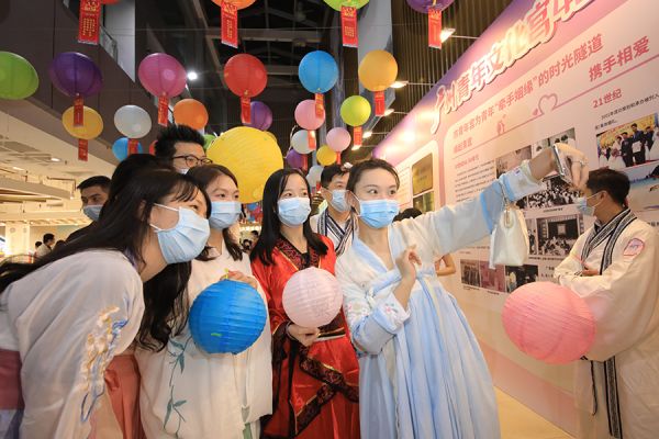 广州青年报讯(实习记者 张倩珊 朱丽颖 通讯员 穗团宣)七夕当晚,一群古风青年锦衣罗裙,手执摇扇灯笼,仰面观赏聆听广州青宫橱窗剧场上唱响的袅袅古风曲,有如时空交错的人景画,引得北京路上的行人纷纷驻足,既赏歌、赏人,又赏景。