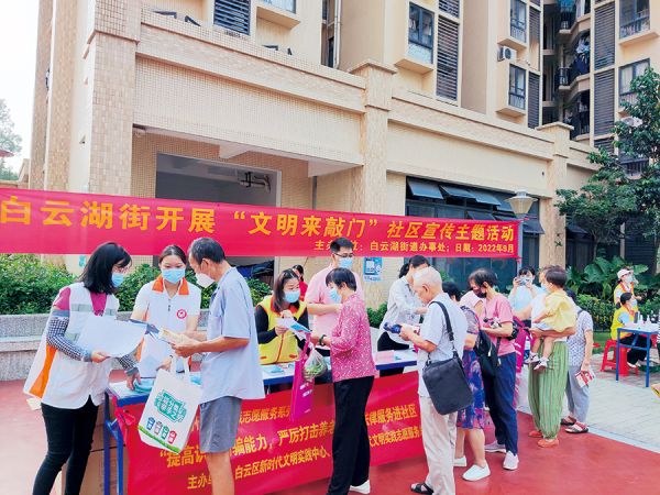 广州青年报讯(见习记者 王晨辉 通讯员 何意君)日前,广州市白云区白云湖街创文办组织志愿者,深入南悦第三社区开展“文明来敲门”社区活动宣传,倡导更多市民群众进一步积极参与、热情支持创建全国文明城市工作。