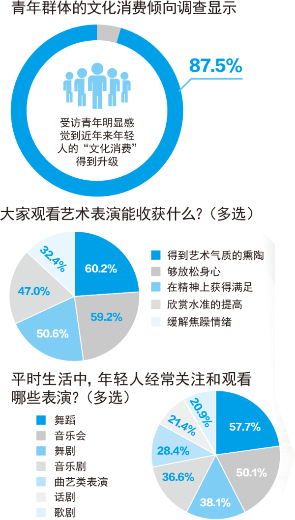 据中国青年报社社会调查中心对青年群体的文化消费倾向发起的调查显示,87.5%的受访青年明显感觉到近年来年轻人的“文化消费”得到升级。许多曾经的小众艺术得益于青年的青睐从而逐渐走到了台前。姚泽楠对此就有着明显的感受:“虽然广州的戏剧演出生态一直被人调侃为‘广寒宫’,但随着年轻人对舞台戏剧的接触和涌入,如今的剧场已经成了年轻人新的聚集地。”对现在的年轻人来说,组团看戏已经如同看电影一般家常便饭。