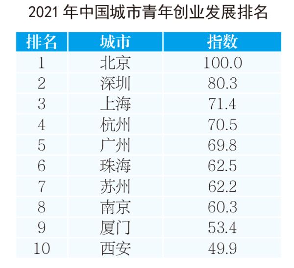 报告显示,随着国家创业环境不断改善,创业扶持政策不断细化,2015至2021年,中国青年创业发展指数由100升至171.0。在50座2021年青年创业友好型城市中,北京、深圳、上海位列前三甲,一线城市、发达省会城市及东部发达地级市排名居前。报告指出,创业资金、社会资源和知识储备是青年创业主要面临的困难,加大创业税收优惠政策支持力度和简化行政审批手续是超六成青年创业者的主要诉求。