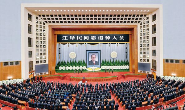 我们缅怀江泽民同志的优秀品格和高尚风范。江泽民同志目光远大、审时度势,总是从中国和世界发展大势、从党和国家工作全局出发观察和思考问题,不断推进理论创新和其他各方面创新。江泽民同志信念坚定、处事果断,总是把党和人民放在心中最高的位置,始终不渝坚持共产党人的理想信念,在关键时刻具有作出果敢决策的非凡胆略和进行理论创新的巨大勇气。江泽民同志尊重实践、与时俱进,总是紧紧把握时代发展脉搏和契机,坚持从党和人民活生生的实践出发总结经验、寻找路子,脚踏实地而又开拓进取推进党和国家各项工作。江泽民同志尊重群众、关心群众,总是高度关注人民群众安危冷暖,依据最广大人民根本利益来检验和推动工作。江泽民同志的优秀品格和高尚风范将永远教育和激励我们前进。