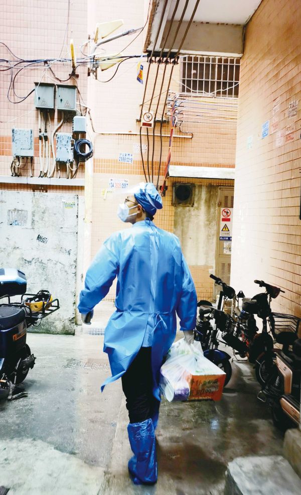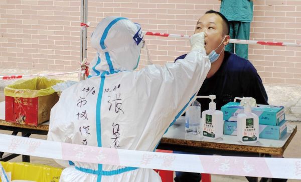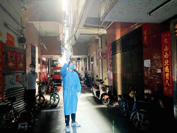 “落来做核酸啦!”团员青年用大喇叭通知居民下楼核酸