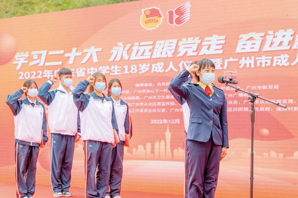 12月13日上午,2022年广东省中学生18岁成人仪式暨广州市成人宣誓仪式在从化区吕田镇莲麻村黄沙坑革命旧址纪念馆举行。本次活动由团省委指导,市委宣传部、市关工委、团市委、市教育局、市人力资源和社会保障局、市卫健委、广州地铁集团、广州日报社、广州广播电视台共同主办,广州青年运动史研究和青少年融媒体中心、从化区委宣传部、从化区团委、广州城建技工学校承办,市无偿献血办、市禁毒馆协办。