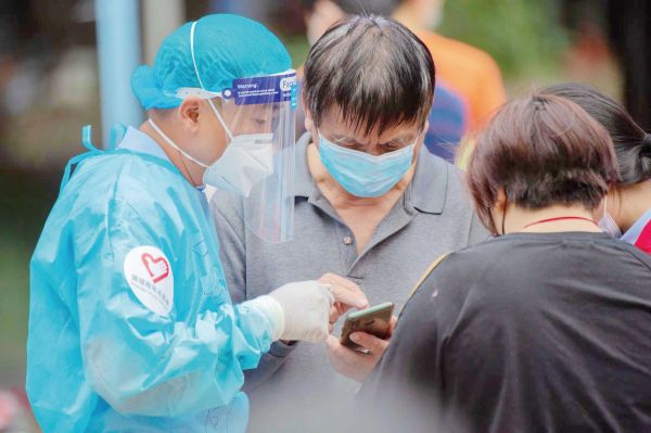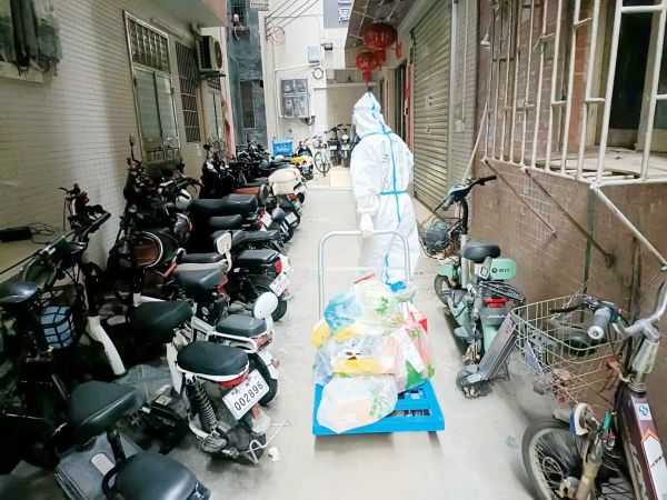 一次上门摸查,潘顺鑫发现一户居民夫妇均为残疾人,下楼领取生活物资很不方便,便自告奋勇承担起每天为他们配送物资的任务。“虽然工作很累,但听到居民们说的一声声‘谢谢’,心里还是觉得暖洋洋的。”潘顺鑫说道。为了避免居民在长期封控中出现抵触情绪,他还与其他志愿者协助居民建立了沟通群,耐心地向群众讲解封控措施,第一时间为群众排忧解难,筑起了一道坚不可摧的“白色长城”。