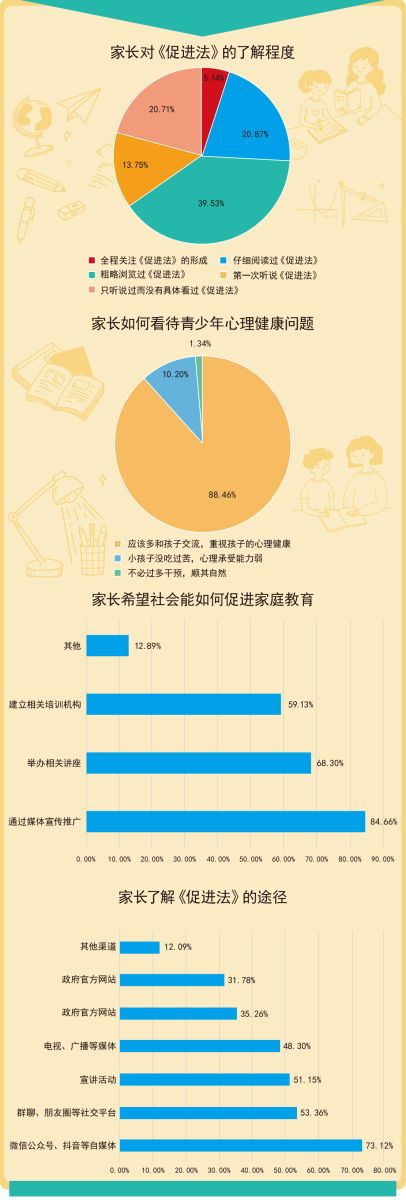 在《促进法》正式施行一周年之际,广州市花都区三立社会工作服务中心发布了一项面向学生家长的社会调查,对《促进法》在家长群体中的普及程度、家庭教育的落实情况、所起的引导作用等进行了一次全面的调查,共计回收有效调查样本1265份。