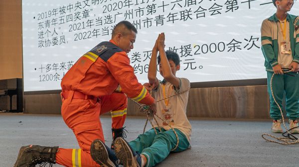 在互动环节,苏金标不仅分享了许多发生火情时的逃生、救援技巧,还邀请了十余位同学上台,与他一同演示了逃生安全绳的打结方法,台下师生专注观摩,在现场引起热烈反响。