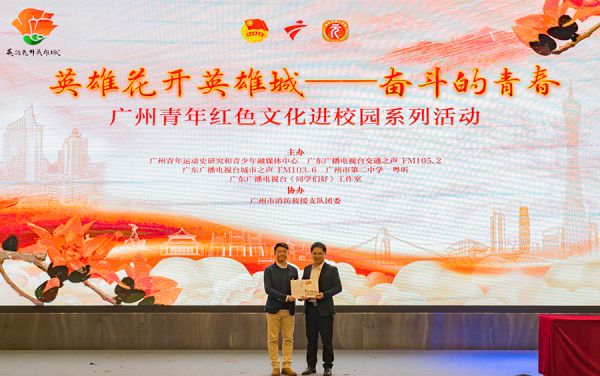 3月6日,“英雄花开英雄城——奋斗的青春”广州青年红色文化进校园系列活动在广州市第二中学举行,活动由广州青年运动史研究和青少年融媒体中心、广东广播电视台交通之声FM105.2、广东广播电视台城市之声FM103.6、广州市第二中学、粤听、广东广播电视台《同学们好》工作室主办,广州市消防救援支队团委协办本次活动。团市委宣传部部长麦文辉为广州市第二中学颁发了“新绿书屋”牌匾,广州青运青融中心主任袁卫根向学校团委赠送了《漫话团一大》《团一大青年说》等青少年红色文化经典书籍,广州市第二中学副校长陈健及团委书记陈广乙代表学校分别接受了牌匾和书籍。广东广播电视台交通之声与城市之声总监陆敏华、广州青运青融中心总编辑符国章、广东广播电视台主持人赵智豪等嘉宾以及近600名师生参加活动。