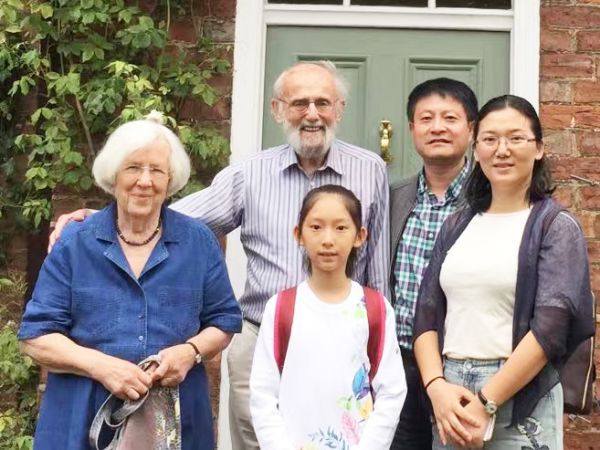 2018年8月6日,我们一家(图右一、二、三)在英国约克古城拜访国际通草画研究专家、收藏家伊凡·威廉斯夫妇(图左一、二)后合影留念。
