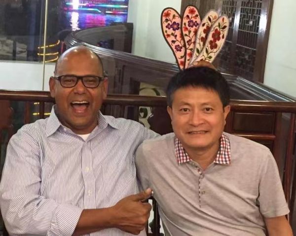 2016年10月,我爸爸张得渊(图右)送了两双我奶奶绣的甘肃非遗绣花鞋垫给美国友人、跨国公司高管(图左),朋友赞不绝口。