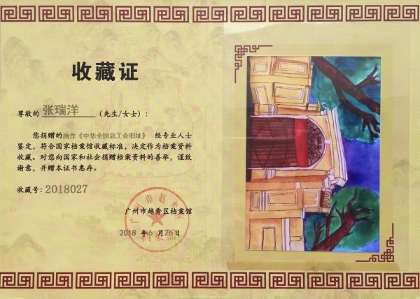 2018年6月,通草画传承人苏昕老师指导我创作的通草画作品《中华全国总工会旧址》被越秀区档案馆永久收藏,当时我10岁。