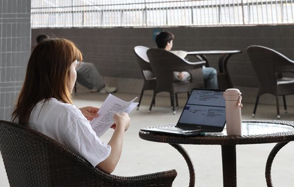穿过广财图书馆三楼安静的学习阅览区,打开一扇玻璃门就能到达室外区域。这里摆放着不少桌椅、绿植等设施,从这里望出去,既能看到校园的绿茵足球场,又能远眺繁华的珠江新城和广州塔。这片区域,被馆方取了个有趣的名字——“发呆区”。