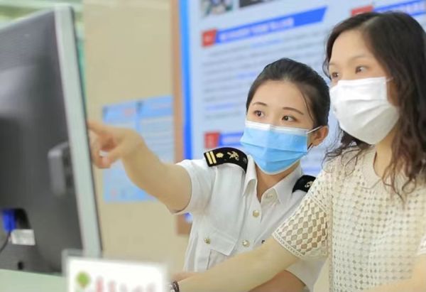 林明远(左一)通过“单一窗口”为企业介绍线上报关流程 (来源:南沙海关摄影协会)