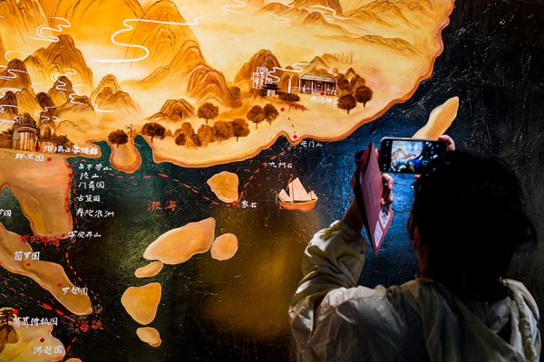 广州海事博物馆展厅里,游客用手机拍摄唐宋时期海上丝绸之路的行进线路,记录旅途美好 陈海燕/摄