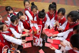 天河区奥体东小学校园内张灯结彩,锣鼓喧天,“奥妮”“奥利”们在阳光操场上互送新年祝福,共同回顾此前“开元日”的心愿卡。