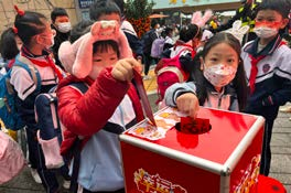 广州市海珠区实验小学在学校门口设立了筑梦箱,穿着整齐校服、背着崭新书包的同学们排起了长龙,等着将自己的新年心愿投入筑梦箱。