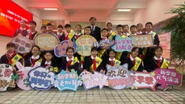 番禺区祈福英语实验小学的校长和大队委早早来到学校大门口,等待“玉兔”归来。现场有英姿飒爽的仪仗队欢迎同学们回归,让孩子们感受到回到家的温暖。