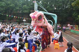 荔湾区西华路小学学生与广州南大舞狮协会合作的舞狮队把平安、健康、聪慧带到了校园的每个角落,看得孩子们心潮澎湃,欢呼雀跃。