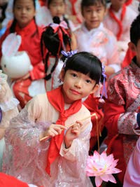越秀区珠光路小学的孩子们穿上唐装汉服,向国家级非遗传人学习广彩、榄雕、醒狮、广式插花、广府拓画、广式汤圆等六个项目,并进行互动体验活动。