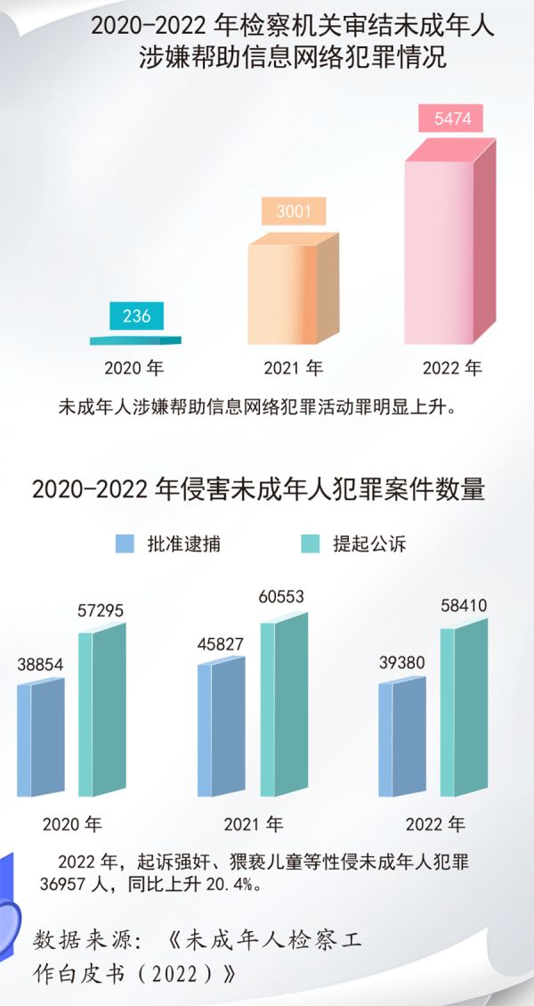 数据显示,2020年至2022年,检察机关审结(含起诉、不起诉)未成年人涉嫌帮助信息网络犯罪活动罪犯罪人数分别为236人、3001人、5474人,2022年较2021年同比上升82.41%。