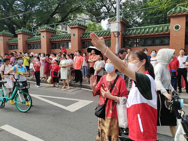 从化中学,志愿者与考生击掌,为他们加油鼓劲