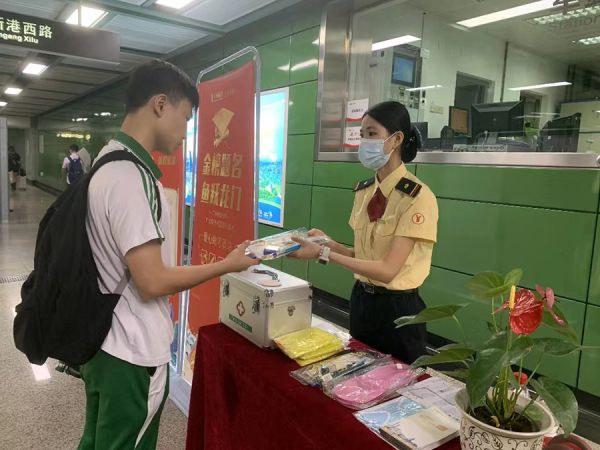 广州地铁团委为满足考生赴考可能出现的不时之需,在12个邻近考点的重点站设置了“爱心助考驿站”,配备爱心文具袋、爱心药箱、一次性雨衣等便民物资,供考生免费领取使用。