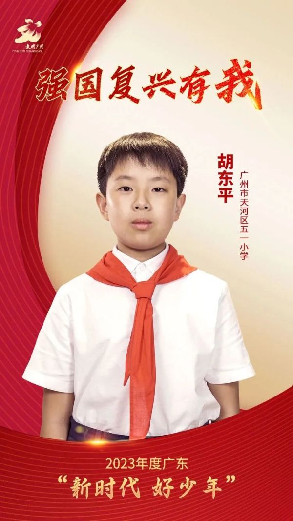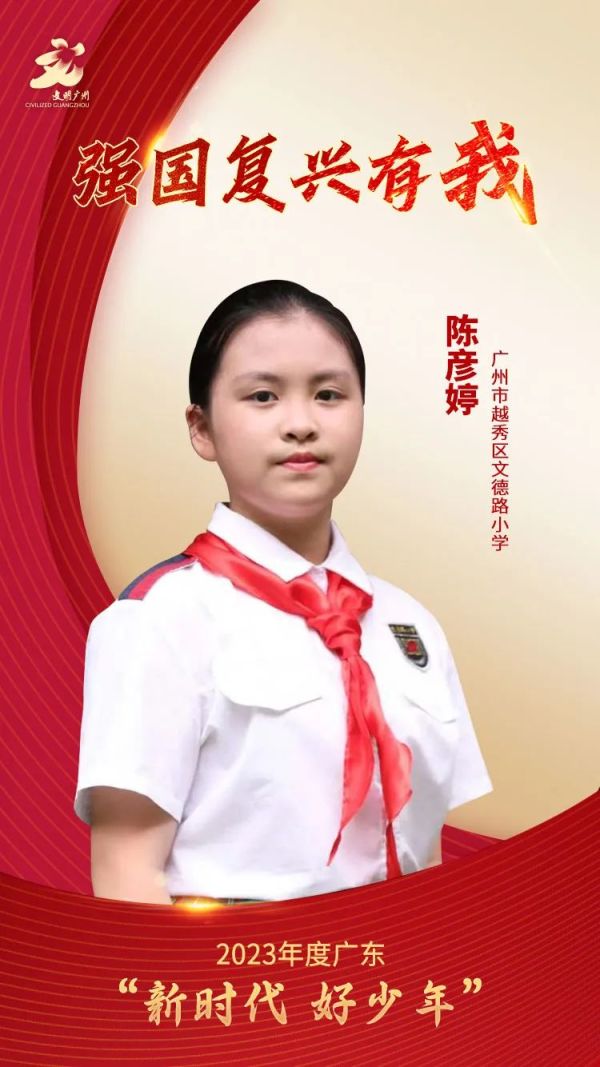 他是红色文化小讲解员和社会主义核心价值观的小宣传员,多次参与省市区各级文明办组织的红色品牌活动,参与全国少工委出品的《少年之光》歌曲MV录制。曾获全国优秀少先队员、广东省优秀少先队员、广东省“红领巾奖章”四星章、广州新时代好少年、广州明日之星阅读小标兵、广州好家风10后代表、广州红领巾宣讲员等多项荣誉称号。
