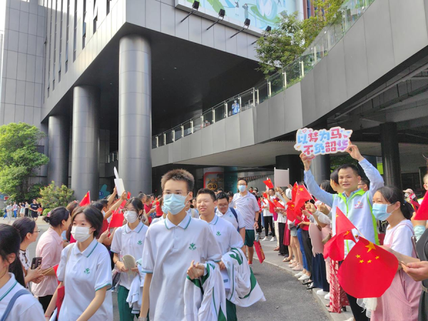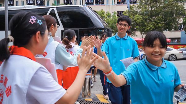 从化区流溪中学考场,青年志愿者与考生击掌加油