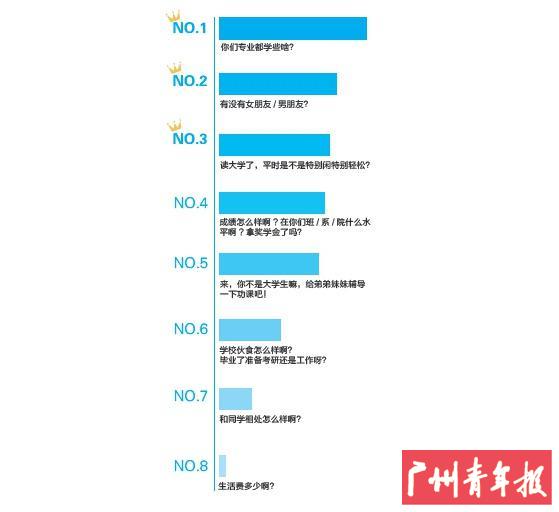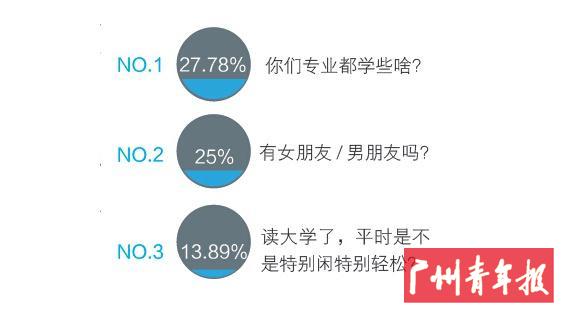 根据本报记者在大学城学生中所做调查,“你们专业都学些啥”以27.78% 的投票率成为过年回家最讨厌被问到的问题。紧跟其后的则是“有女朋友/ 男朋友吗”、“成绩怎么样啊? 在你们班/ 系/ 院什么水平啊?拿奖学金了吗”和“读大学了,平时是不是特别闲特别轻松”,分别以25% 和13.89% 的得票率名列第二和第三。