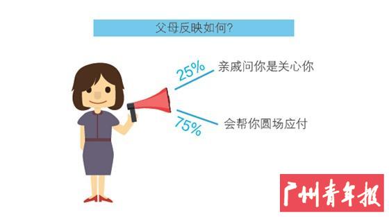 面对亲戚的拷问难题,也有22.22% 的同学表示曾经跟父母沟通过,说明自己不想应付。75% 得知孩子情绪后的父母,会在亲戚提问时帮孩子接话茬圆场,抵挡亲戚来势凶猛的提问。