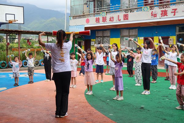 华南师范大学“晨曦服务队”在清远市连山县桂联村委会开展三下乡社会实践活动,趣味教学瑶族长鼓舞,让孩子们享受节奏的魅力,尽情展现自我。何远芳/摄